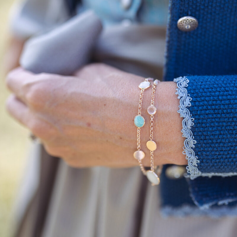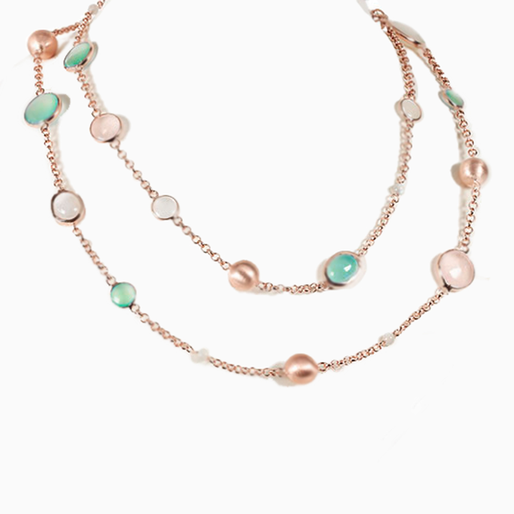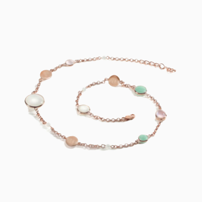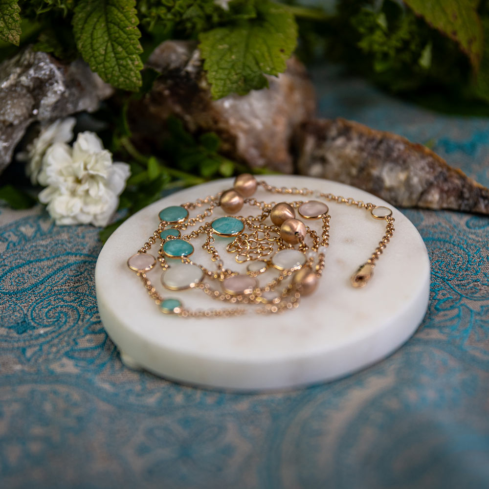 Die Amazonit-, Mond- und Rosenquarzsteine in verschiedenen Größen sind rund gefasst und verteilen sich auf die rosègoldfarbene Kette.