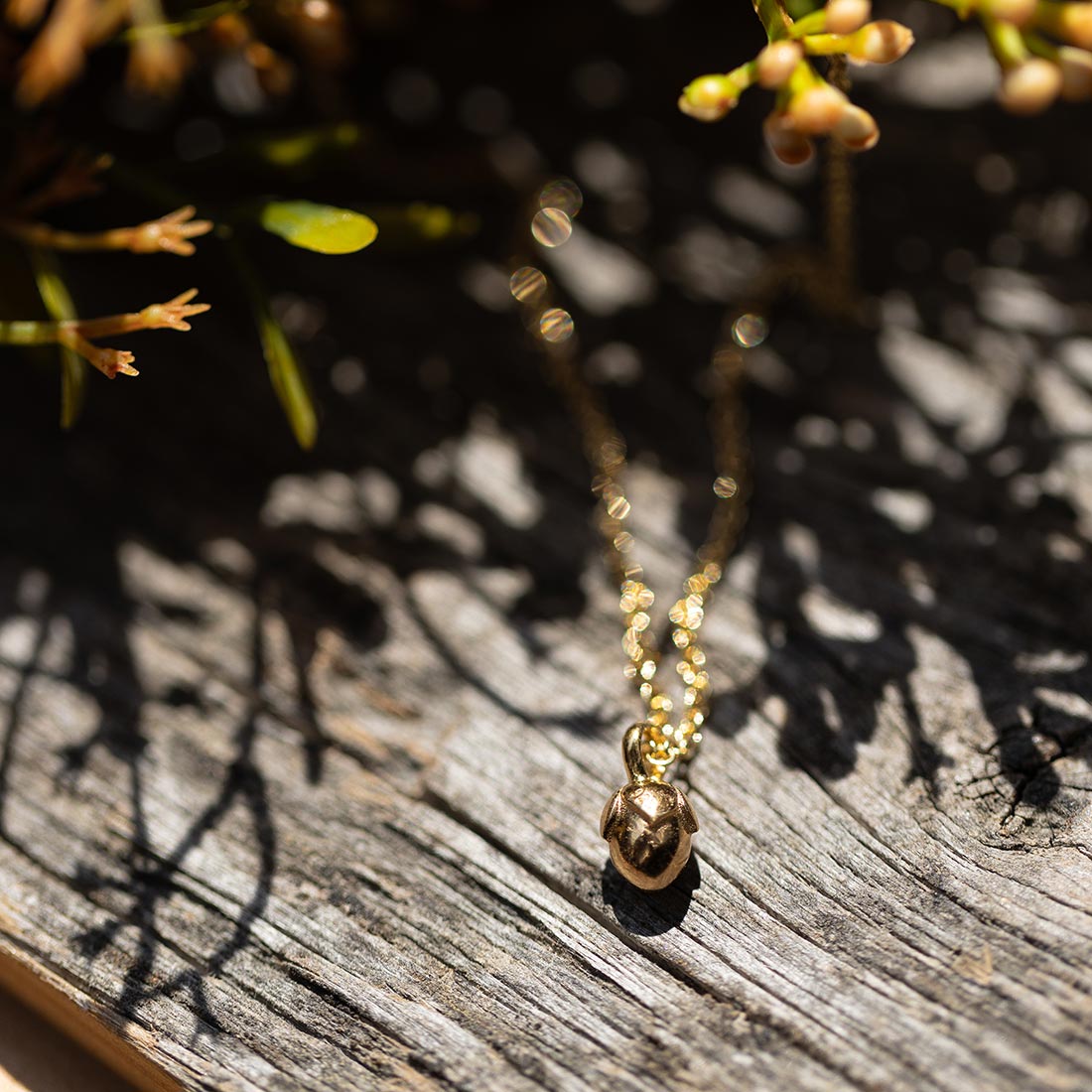 Als Hommage an diese Nuss, die auch bei uns in Bayern als heimischer Strauch vertreten ist, haben wir die "Verzauberte Haselnuss" als Halskettenanhänger aus 925 Sterlingsilber kreiert und in Gelbgold vergoldet. Sie baumelt wahlweise an einer 40 oder 45 cm langen, filigranen und auf Hochglanz polierten Ankerkette.