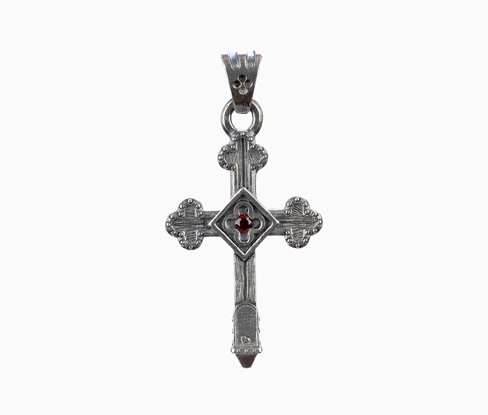 Handgefertigter Gipfelkreuz-Anhänger aus massivem 925er Sterlingsilber mit facettiertem Granat • In zwei Größen und wahlweise mit der passenden Kette erhältlich • Inspiriert vom Gipfelkreuz des Wendelstein