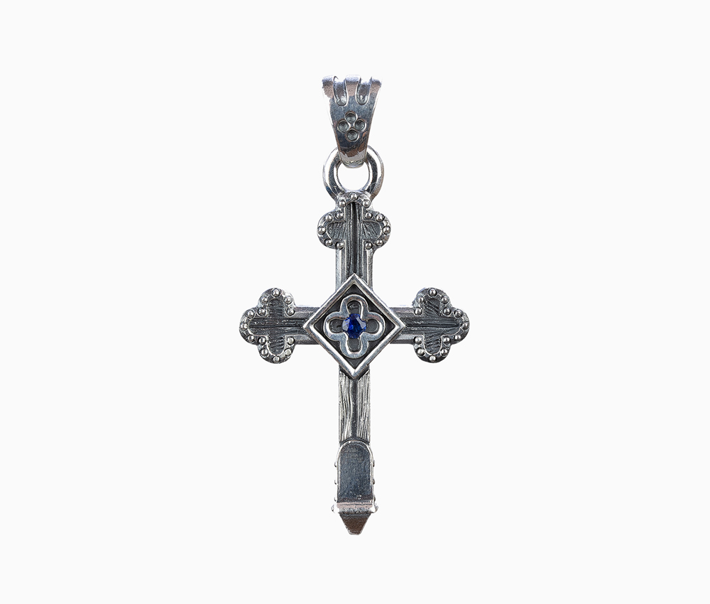 Handgefertigter Gipfelkreuz-Anhänger aus massivem 925er Sterlingsilber mit facettiertem Saphir • In zwei Größen und wahlweise mit der passenden Kette erhältlich • Inspiriert vom Gipfelkreuz des Wendelstein
