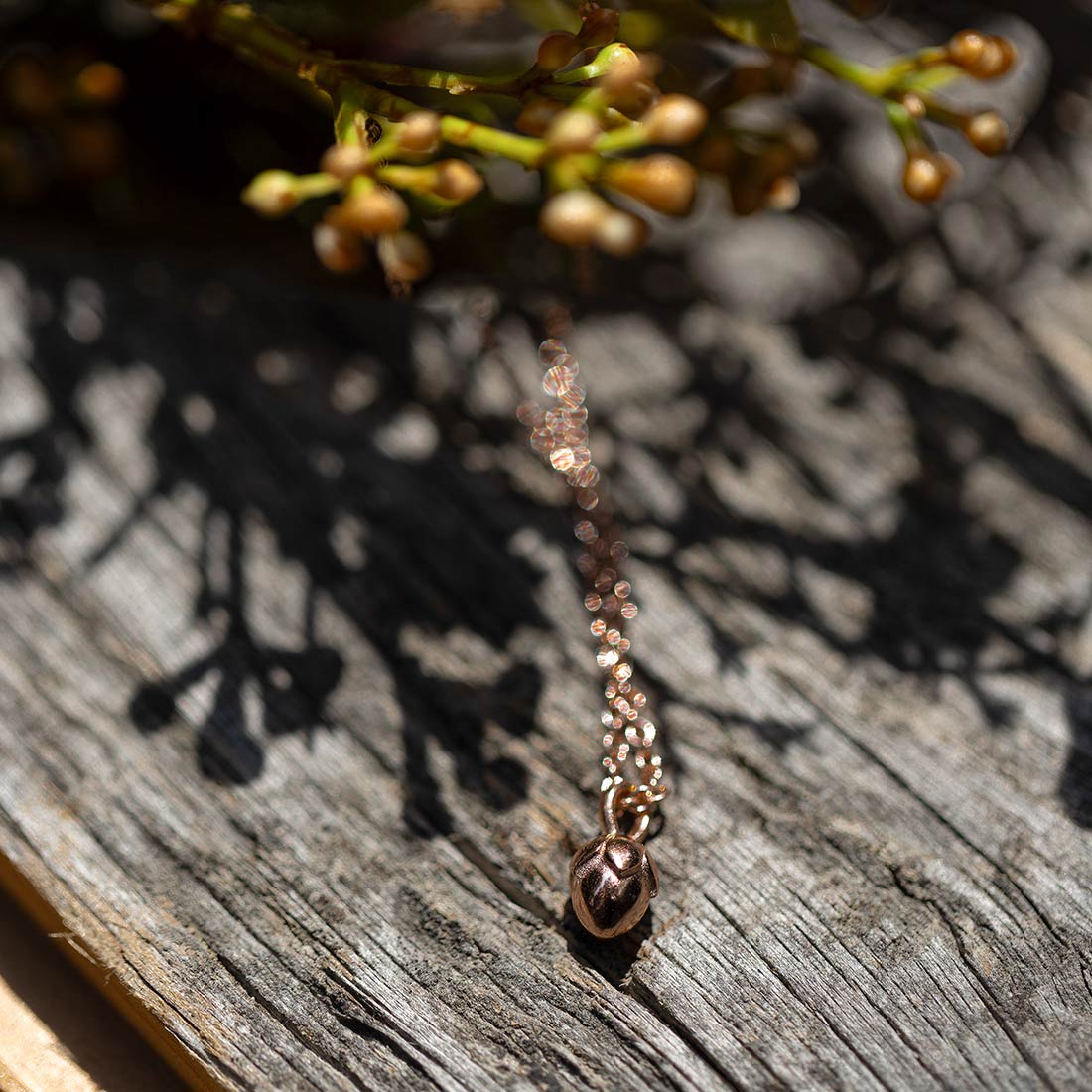 Als Hommage an diese Nuss, die auch bei uns in Bayern als heimischer Strauch vertreten ist, haben wir die "Verzauberte Haselnuss" als Halskettenanhänger aus 925 Sterlingsilber kreiert und in Roségold vergoldet. Sie baumelt wahlweise an einer 40 oder 45 cm langen, filigranen und auf Hochglanz polierten Ankerkette.