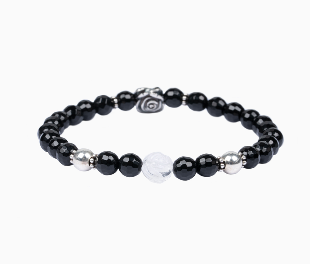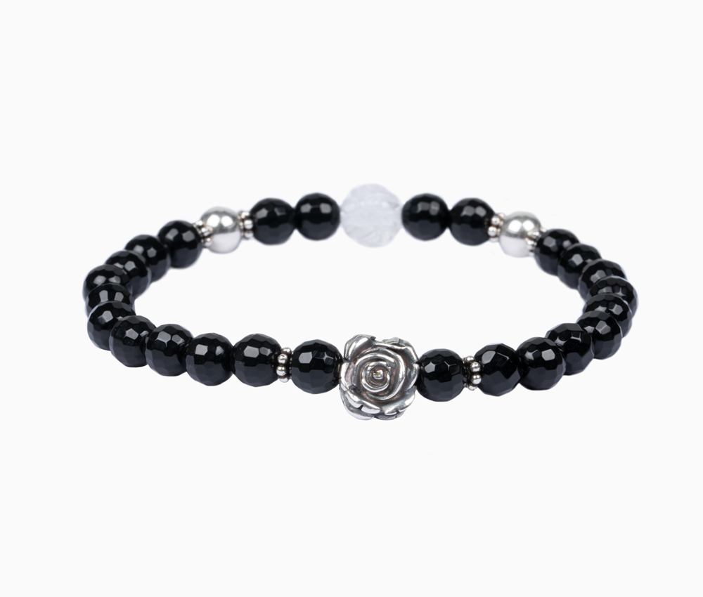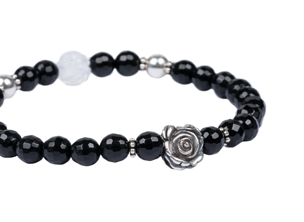 Edelsteinarmband aus 6mm facettiertem Onyx • Rose und weitere Elemente aus 925er Sterlingsilber • Bergkristallperle in Rosenform • Flexibles und besonders reißfestes Armband • Du erhältst das Armband in 3 bis 5 Werktagen