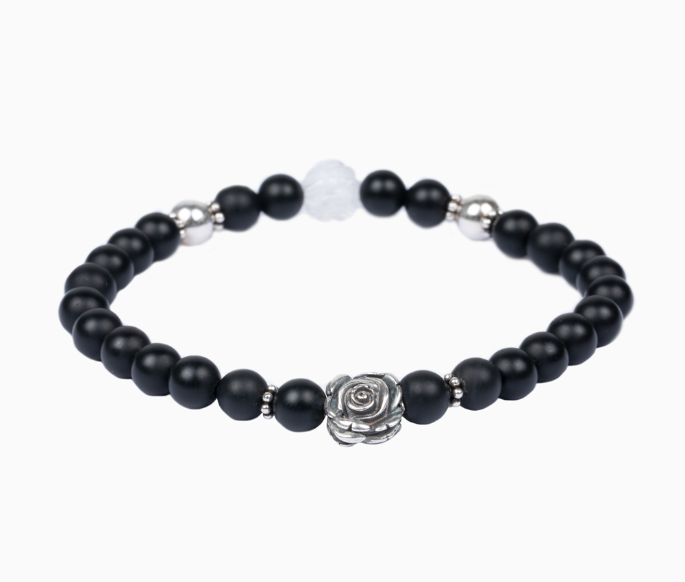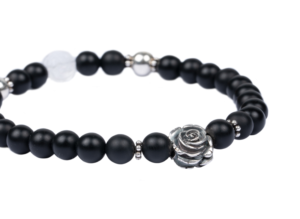 Edelsteinarmband aus 6mm mattem Onyx • Rose und weitere Elemente aus 925er Sterlingsilber • Bergkristallperle in Rosenform • Flexibles und besonders reißfestes Armband • Du erhältst das Armband in 3 bis 5 Werktagen
