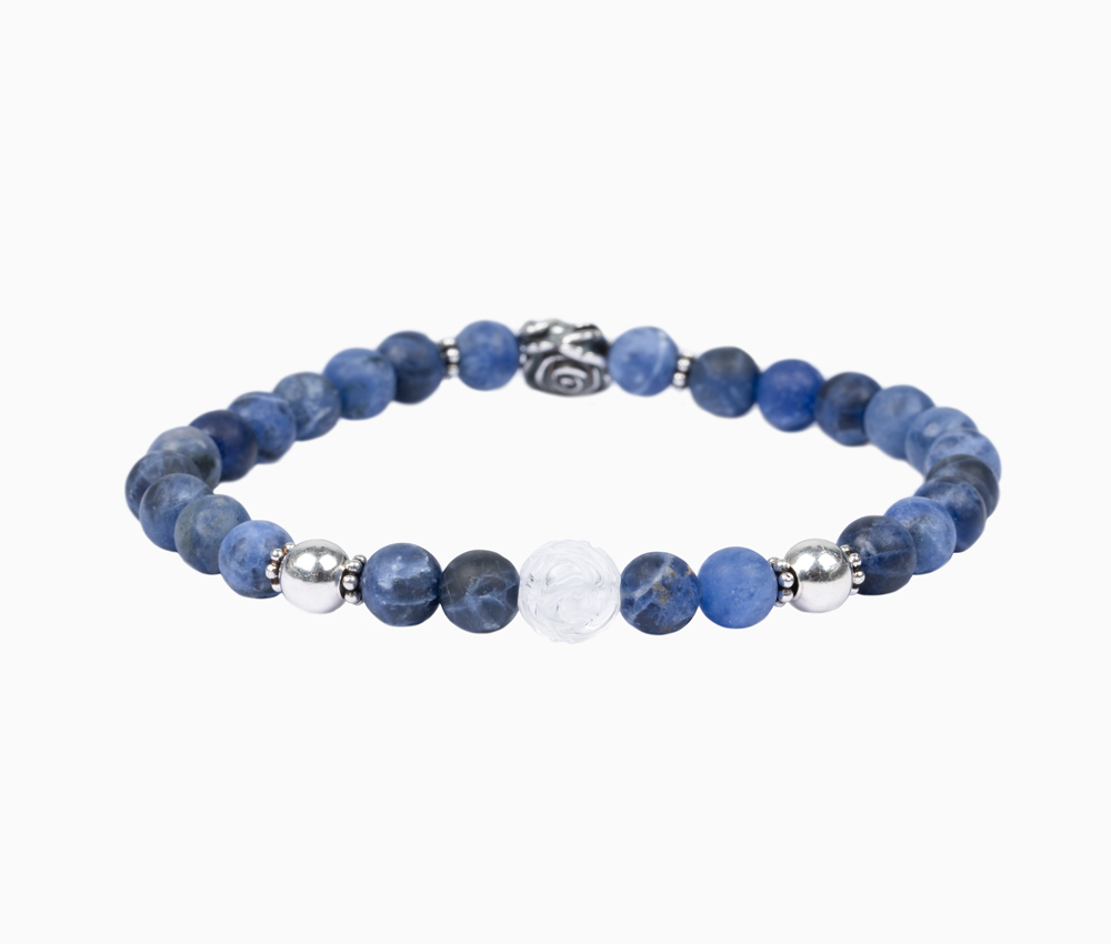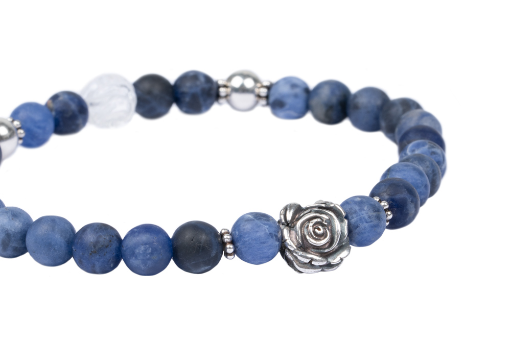 Edelsteinarmband aus 6mm Sodalith • Rose und weitere Elemente aus 925er Sterlingsilber • Bergkristallperle in Rosenform • Flexibles und besonders reißfestes Armband • Du erhältst das Armband in 3 bis 5 Werktagen