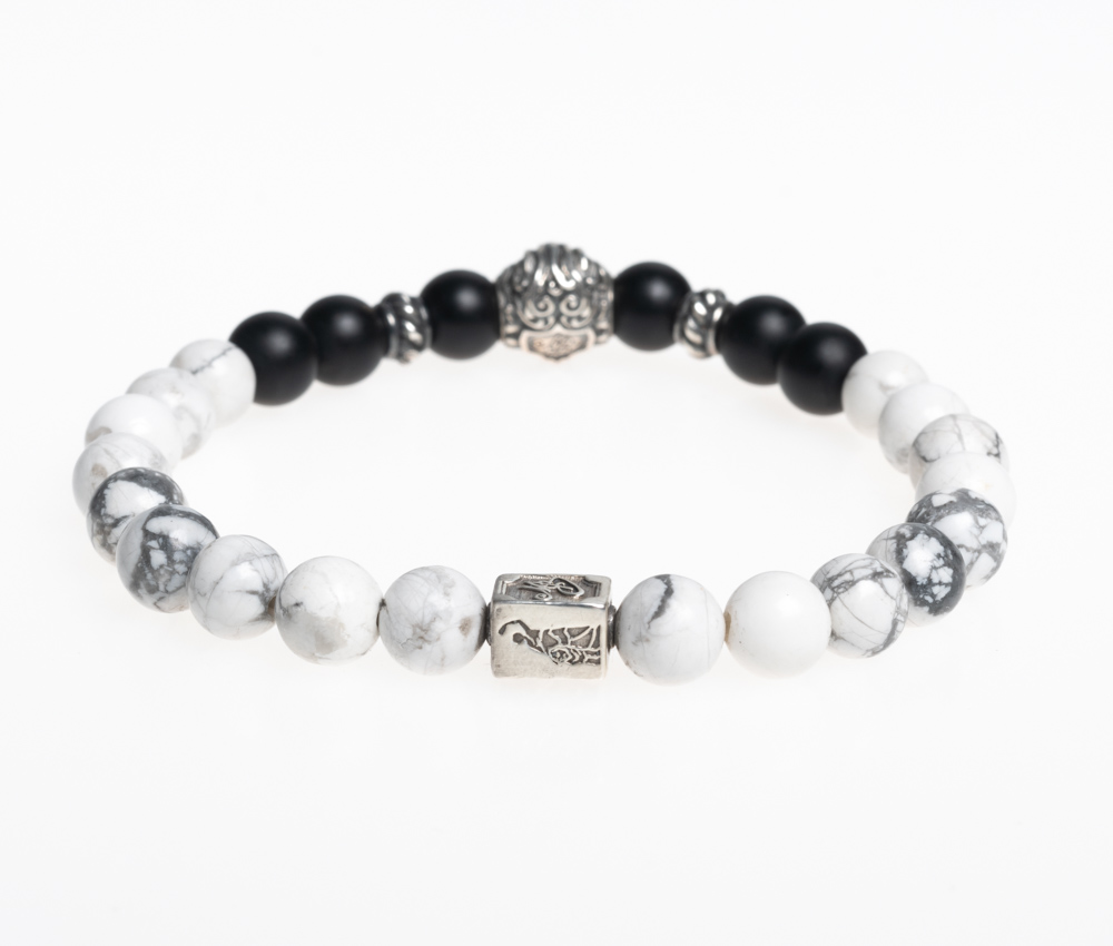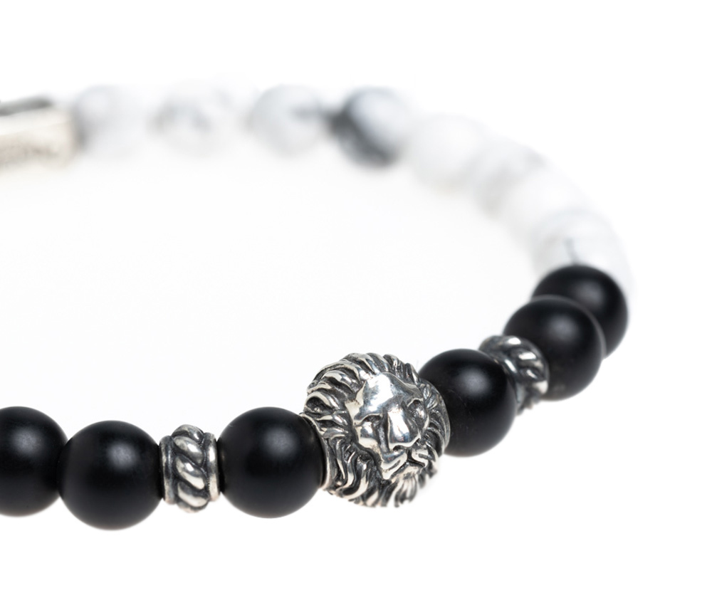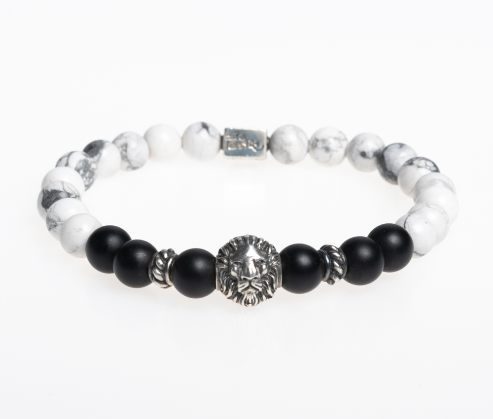 • Edelsteinarmband aus 8mm Howlith und mattem Onyx • Chiemgaulöwe, MB Nugget und weitere Details aus 925er Sterlingsilber • Flexibles und besonders reißfestes Armband • Du erhältst das Armband in 3 bis 5 Werktagen