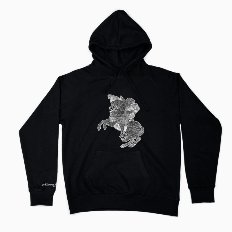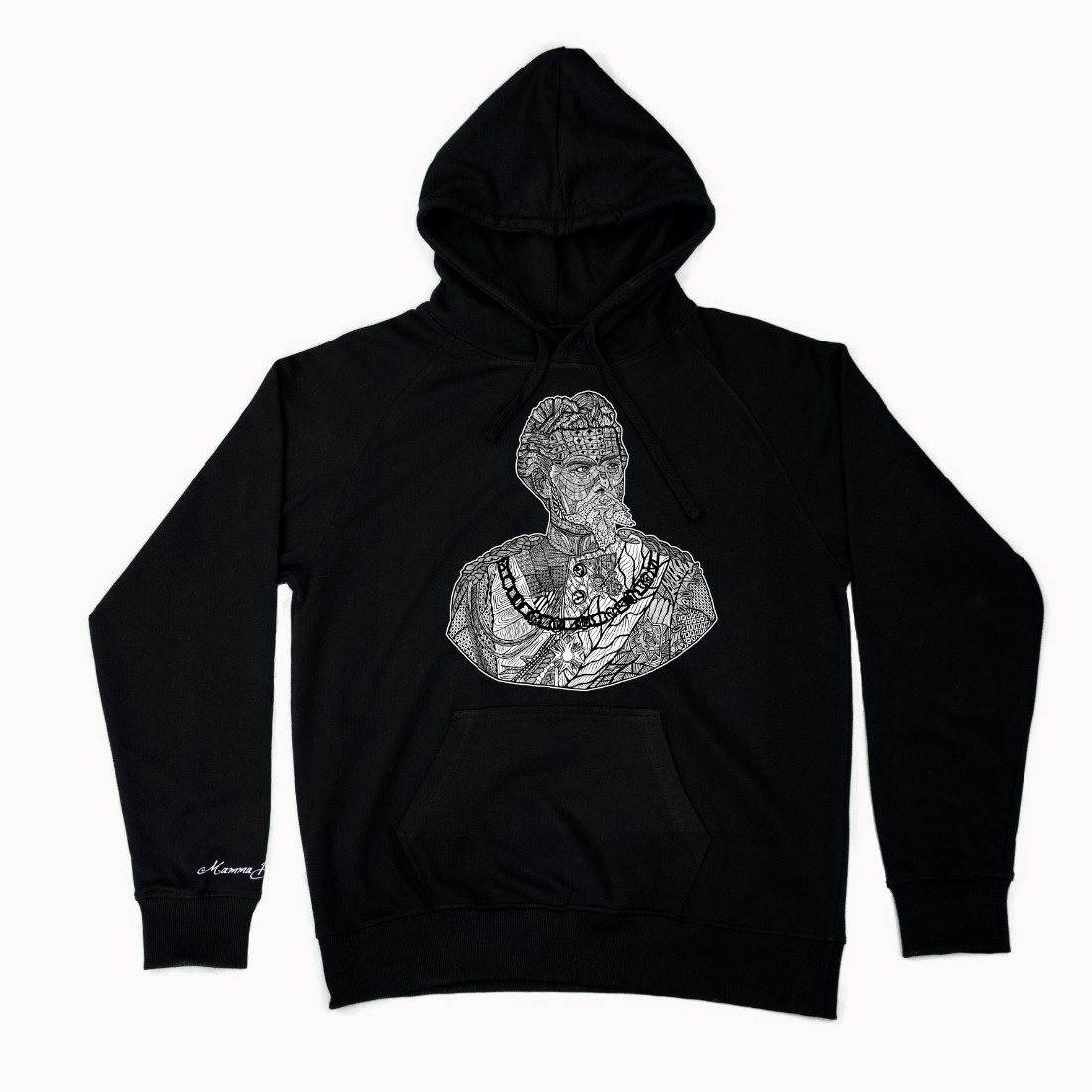 Hoodie aus 100% Baumwolle • normale Passform • ÖKO-Tex zertifiziert Standard 100 • Mit handgezeichnetem Motiv von Ludwig II  im “Maori Bavaria” Stil • MB Schriftzug am rechten Ärmel • Flo ist 1,83m und trägt die Größe L