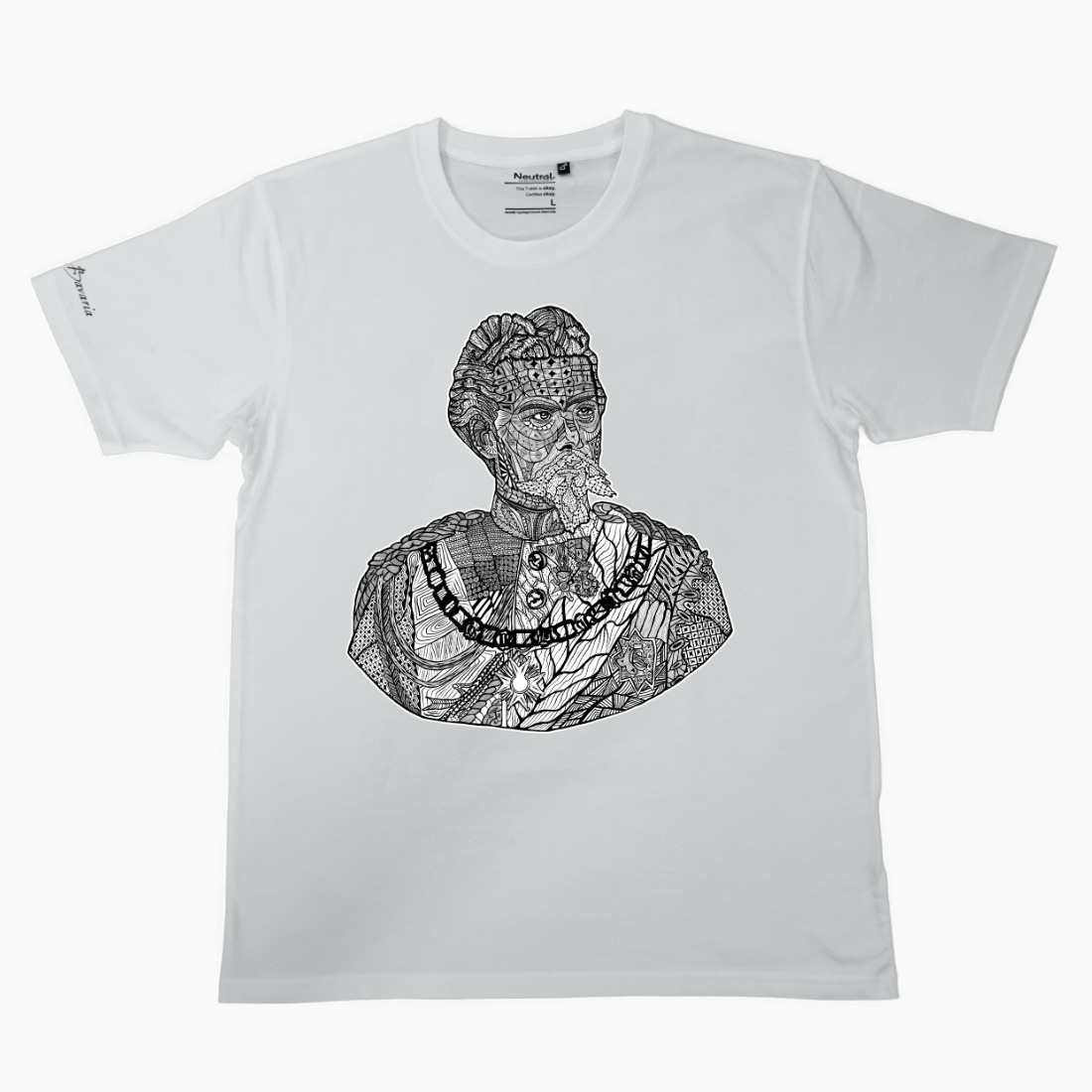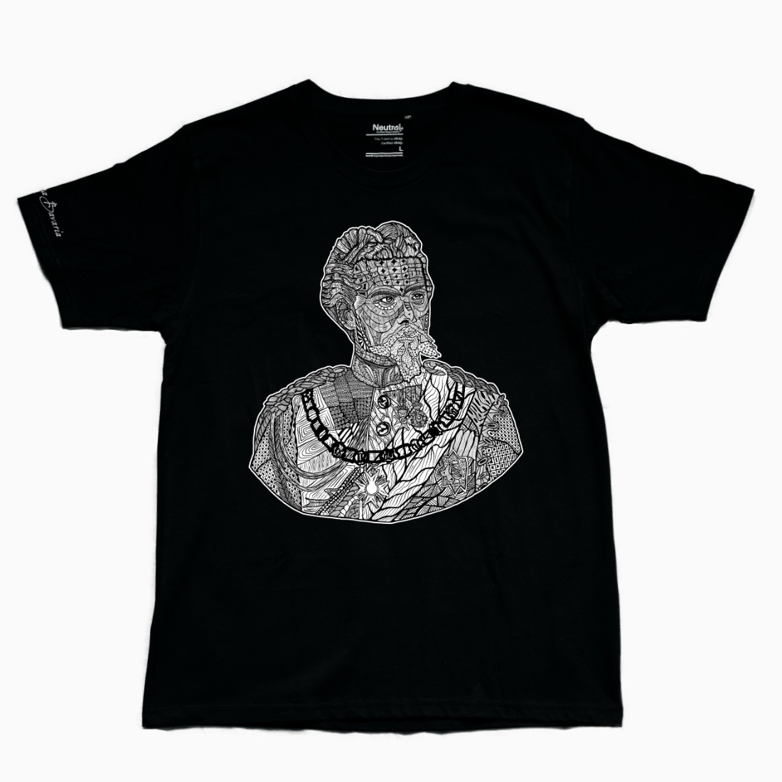 Kurzärmliges Shirt aus 100% Baumwolle • normale Passform • ÖKO-Tex zertifiziert Standard 100 • Mit handgezeichnetem Motiv von Ludwig II im “Maori Bavaria” Stil • MB Schriftzug am rechten Ärmel