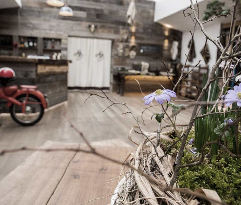 Die Holzdielen knarren, die Wände sind mit altem Holz verkleidet und Geweihen dekoriert. Helles und wohliges Licht fällt durch den komplett verglasten Dachstuhl.